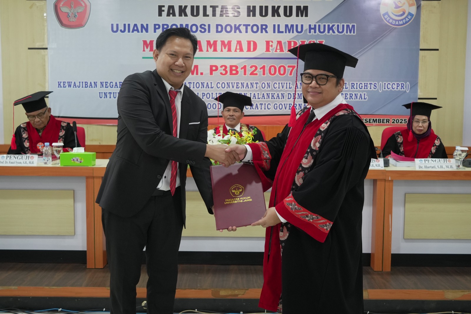 Dengan kelulusan ini, Fakultas Hukum Universitas Jambi berharap disertasi ini dapat memberikan kontribusi nyata bagi penguatan demokrasi di Indonesia, khususnya dalam reformasi partai politik dan penegakan hak politik yang substansial sesuai standar hukum internasional.